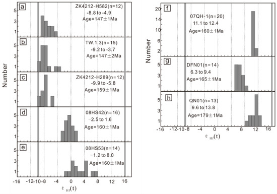 Figure 12. Frequency distributions of εHf(t) values of zircons from (a) Zhuxi two-mica granite, (b) Zhuxi biotite granite, (c) Zhuxi granodiorite, (d) Lisong monzogranite, (e) Lisong mafic microgranular enclaves, (f) Qinghu monzonite, (g) Dafengnao syenite, and (h) Huangbu syenite. The data for Lisong monzogranite, mafic microgranular enclaves, and Qinghu monzonite are from [67]; data for Dafengnao syenite and Huangbu syenite are from [122].