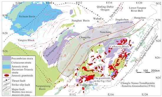Figure 13. Simplified geological map of South China delineating the distributions of the Jurassic magmatic rocks, biotite–two-mica–muscovite zone and Changle–Nanao Trondhjemite–Tonalite–Granodiorite (TTG) (modified from [109,111,122,123,124,125].