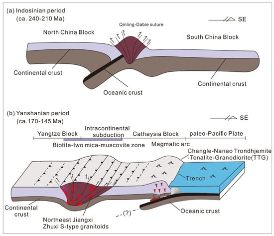 Figure 14. Tentative dynamic model of the Mesozoic tectonic evolution of South China. (a) Earlier stage (ca. 240–210 Ma) continental collision between the North and South China blocks along the Qinling–Dabie suture [97]. (b) Later stage (ca. 170–145 Ma) intracontinental subduction in response to distant stresses triggered by subduction of the Paleo–Pacific Plate (modified from [70,102].