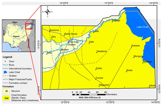 - Olabode, S.O.; Adekoya, J.A.; Ola, P.S. Distribution of sedimentary formations in the Bornu Basin, Nigeria. Pet. Explor. Dev. 2015, 42, 674–682. [Google Scholar] [CrossRef]