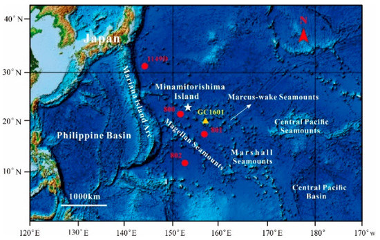 - Okamoto, N.; Usui, A. Regional Distribution of Co-Rich Ferromanganese Crusts and Evolution of the Seamounts in the Northwestern Pacific. Mar. Georesources Geotechnol. 2014, 32, 187–206. [Google Scholar] [CrossRef]