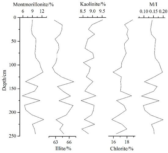 | Layer/cm | Relative Content of Clay Minerals (%) | M/I | Illite | ||||