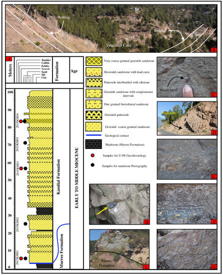 The Kamlial Formation has transitional contact with the underlying Murree Formation (Figure 2I), while the upper contact is not exposed in the study area. However, in the vicinity of the studied area, it is conformable with the overlying Chinji Formation of the Siwalik group.