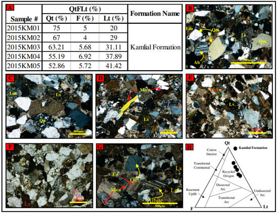 The percentage composition of the framework grains calculated through the point-counting method suggests that the quartz concentration ranges between ≈52 and 75%, the feldspar concentration ranges between 4 and 6.92%, and the lithics concentration ranges between 20 and 41.42% (Figure 3A). The data plotted on the QtFLt diagram of the Dickinson [46] placed the samples of the Kamlial Formation within the recycled orogen provenance (Figure 3H).