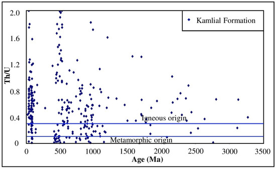 In addition, the zircon Th/U ratio is also an important elemental ratio, which is used to discriminate between the metamorphic and igneous origin zircon [56,57]. The detrital zircon grains derived from the igneous origin possessed a Th/U ratio value > 0.3, whereas the detrital zircons with a Th/U ratio <0.3 indicate the metamorphic origin [57]. The U-Pb ages of the detrital zircons and Th/U ratio plot reflect the detrital zircons’ dominant population from the igneous origin (Figure 5). However, a significant population between ≈400 and ≈1200 Ma reflects the metamorphic origin. This metamorphic episode is most possibly associated with the Pan-African orogeny, which is well documented in the northwestern Himalayas [58]. At the same time, the igneous zircons in this similar age domain might represent the lesser Himalayan granites, which possessed similar ages [59,60]. The younger population of detrital ages < 100 Ma reflects the igneous origin dominantly (Figure 5). In contrast, the younger grains reflect the metamorphic origin, which is more likely associated with Himalayan metamorphism [61,62].