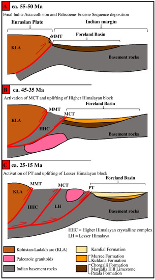 The Himalayas resulted from the India–Asia collision that occurred ≈56 Ma [1,4,7]. Following the collision, a foreland basin was developed in the footwall of the MMT, which received detritus from the accreted Asian terranes, mainly the Kohistan–Ladakh arc (Figure 6A). As a result of the continued subduction of the Indian plate in the north underneath, the Asian plate gave rise to Himalayan belt evolution by southward propagation of the fold-thrust belt.