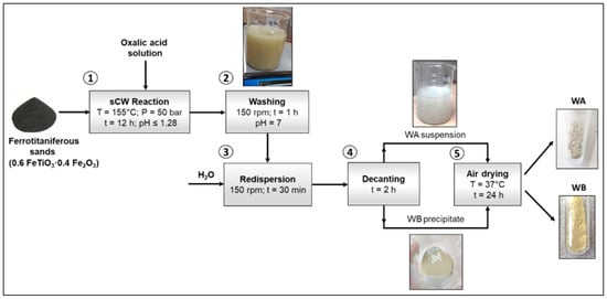 The synthesis was performed in a batch stirred high-pressure reactor system (Berghof BR-500, Eningen unter Achalm, Germany), equipped with a 500 mL PTFE lined vessel. Ilmenite sand (0.9 g) and aqueous oxalic acid solutions of determined molarity (300 g) were loaded into the reaction vessel and the system was assembled. N2 was used to purge the solution inside the reactor and to pressurize the system up to 18 bar. Next, the system was heated up to 155 °C. Once the system reached the set temperature and pressure of 50 bar, the reaction time was accounted for 12 h under constant stirring of 700 rpm. Afterward, the system was cooled down, depressurized and the contents of the reactor vessel collected. The as-synthetized product streams were washed out with Milli-Q water until neutral pH, redispersed in Milli-Q water, and decanted for 2 h. As a result, two fractions were recovered—a whitish suspension containing finer particles (WA) and a yellowish precipitate containing larger particles (WB). Redispersion and decanting were carried out mainly to facilitate the upcoming Le Bail refinement of the as-synthesized products. Finally, these fractions were dried at 37 °C for 24 h prior to storage and characterization. The synthesis scheme is depicted in Figure 1, while the sample codification is shown in Table 1.