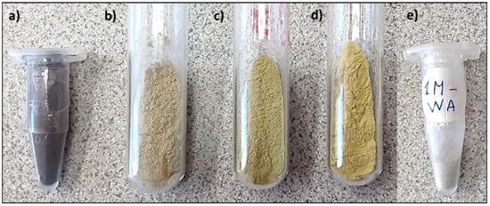 As-synthesized products after the reaction of the precursor sand with oxalic acid solutions at 155 °C and 50 bar: (a) sCW, (b) 0.1 M-WB, (c) 0.5 M-WB, (d) 1 M-WB, and (e) 1 M-WA (other WA powders have the same appearance of 1 M-WA).