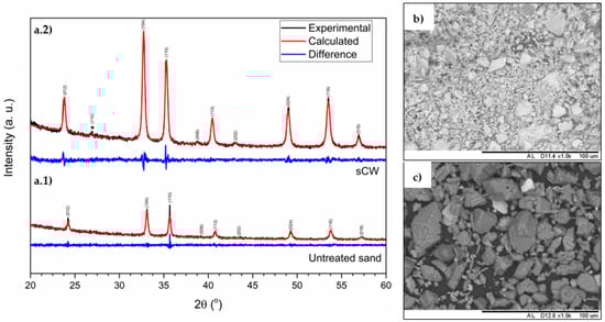 XRPD patterns of the untreated sand precursor (a.1) and the sample treated with sCW at 155 °C and 50 bar (a.2). Unmarked peaks: ilmenite–hematite solid solution, PDF #01-070-8143 []. Marked peaks: rutile, PDF #21-1276. Calculated patterns (in red) obtained by Le Bail adjustment. SEM images of (b) untreated sand precursor and (c) the sample treated with sCW at 155 °C and 50 bar.