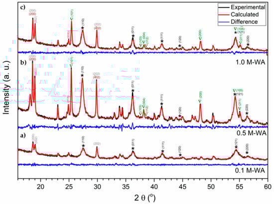 XRPD patterns of (a) 0.1 M-WA powder; (b) 0.5 M-WA powder; and (c) 1.0 M-WA powder, obtained with oxalic acid solutions at 155 °C and 50 bar. Unmarked peaks: ferrous oxalate hydrated. Main crystalline planes of ferrous oxalate hydrate (PDF 72-1305, a = 12.06 Å) indexed in brown and those of ferrous oxalate hydrate (PDF 23-0293, a = 9.84 Å) in gray. Marked peaks: rutile (*), PDF #21-1276 and anatase (∇), PDF #21-1272. Calculated patterns (in red) were obtained through Le Bail adjustment.