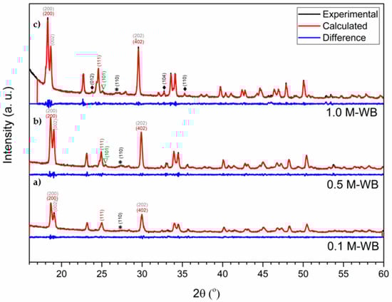 XRPD patterns of (a) 0.1 M-WB powder; (b) 0.5 M-WB powder; and (c) 1.0 M-WB powder, obtained with oxalic acid solutions at 155 °C and 50 bar. Unmarked peaks: ferrous oxalate hydrate. Main crystalline planes of ferrous oxalate hydrate (PDF 72-1305, a = 12.06 Å) indexed in brown and those of ferrous oxalate hydrate (PDF 23-0293, a = 9.84 Å) in gray. Marked peaks: rutile (*), PDF #21-1276; anatase (∇), PDF #21-1272; hematite (♦), PDF # 33-0664. Some weak peaks of trace maghemite overlapped with those of other phases (Supplementary Materials). Calculated patterns (in red) were obtained by Le Bail refinement.