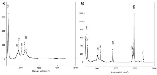 Consistent with the XRPD analyses, the Raman spectroscopic studies of the as-synthesized WA and WB products confirmed that titanium dioxide and ferrous oxalate appeared as the main crystalline phases, respectively. Figure 6 shows the Raman spectra of both fractions, WA and WB, obtained using 1 M oxalic acid solution. In Figure 6a, bands corresponding to a mixture of anatase (149, 400, 516, and 632 cm−1) and rutile (442 and 614 cm−1) were identified []. The spectrum presented in Figure 6b contains a series of characteristic bands of ferrous oxalate (206, 247, 521, 587, 917, 1437, 1470, and 1711 cm−1), similar to the ones observed in humboldtine [] and ferrous oxalate obtained in previous comparable studies [].