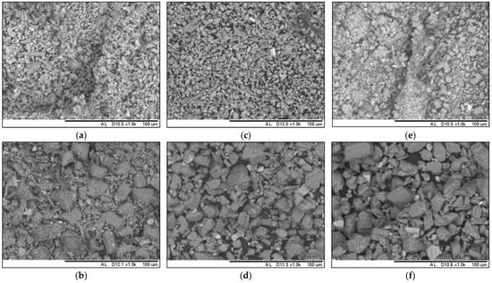 Figure 7 displays SEM images of the WA and WB powders. Since all WA fractions (Figure 7a,c,e) are composed of finer particles (micronic particles < 10 μm and submicronic particles), these products remained suspended in the reaction medium, despite containing TiO2 phases, denser than ferrous oxalate. On the other hand, WB fractions (Figure 7b,d,f), rich in ferrous oxalate, comprise larger particles, the majority of them larger than 10 μm, which decanted. The submicronic particles observed in WB fractions can be related to the TiO2 WA counterparts. As the oxalic acid molarity increases, the quantity of such submicronic particles decreases, as can be seen in Figure 7f. Regarding morphological features, WA powders have irregular-shaped particles, while WB powders exhibit irregular prismatic faceted shapes like slender prisms, similar to those of the sCW sample.