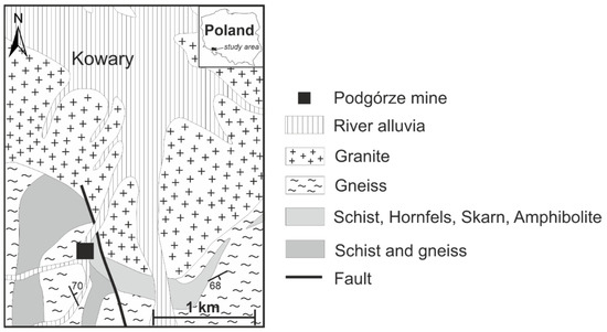 Geological sketch map of Podgórze mine area (based on https://mapy.geoportal.gov.pl/imap/Imgp_2.html (accessed on 25 February 2022); [14]).