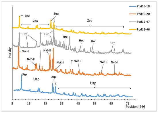 XRD patterns of uranyl arsenates from Podgórze mine. Usp, uranospinite; Nvč-II, nováčekite-II; Hrc, heinrichite; Zeu, zeunerite.