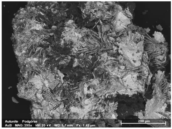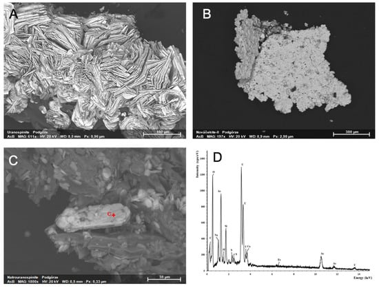 SEM-EDS also confirmed the occurrence of natrouranospinite ((Na2,Ca)(UO2)2(AsO4)2·5H2O) (Figure 4C). Uranospinite and nováčekite-II crystals were also observed by SEM as very small plate crystals (Figure 4A,B). Natrouranospinite formed similar crystals to uranospinite (Figure 4C). Heinrichite is much rarer than uranospinite and nováčekite-II and was found only in the heap.