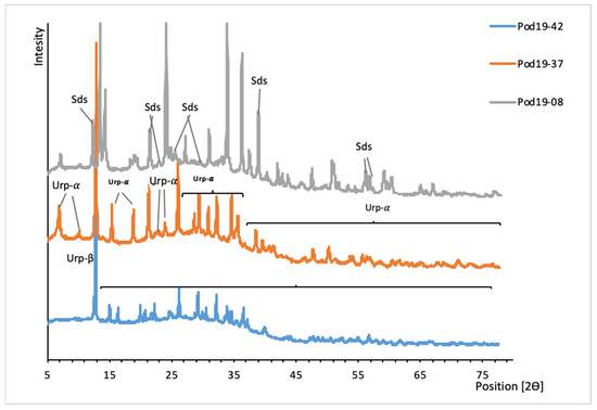 XRD patterns of uranyl silicates from Podgórze mine. Urp-β, uranophane-β; Urp-α, uranophane; Sds, sklodowskite.