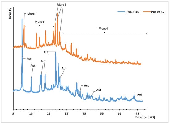 XRD patterns of uranyl phosphates from Podgórze mine. Aut, autunite; Murc-I, metauranocircite.