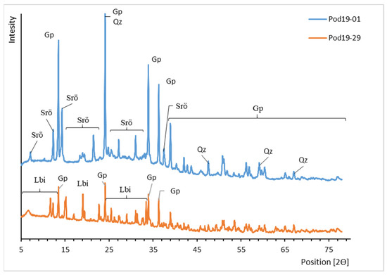 XRD patterns of uranyl carbonates from Podgórze mine. Lbi, liebigite; Srö, schröckingerite; Qz, quartz; Gp, gypsum.
