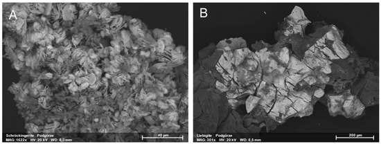 Liebigite (Ca2(UO2)(CO3)3·11H2O) and schröckingerite (NaCa3(UO2)(CO3)3(SO4)F·10H2O) were found in the Podgórze mine (Figure 9). The calculated unit cell parameters of liebigite and schröckingerite are presented in Table 6. Uranyl carbonates occurred in highly ventilated mine gallerias. They crystallize in the bottom parts of adits, especially in places where small heaps were formed from collapsed mine wall galleries, which consisted of very finely crushed rock material. Liebigite occurs as well-formed crystals ranging from a few millimeters up to one centimeter (Figure 10B). In comparison to liebigite, schröckingerite forms smaller aggregates (up to a few millimeters in size). They are composed of small platy crystals with a size of approximately 10 micrometers (Figure 10A). The chemical analyses of uranyl carbonates are presented in Table 7. Only small substitutions of Mg, Mn, Cu, and Fe for Ca and Si for CO3 were detected. Additionally, K substitution for Na was found.