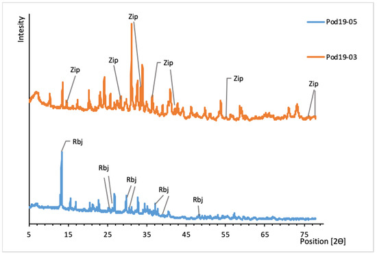 XRD patterns of uranyl sulfates from Podgórze mine. Rbj, rabejacite; Zip, zippeite.