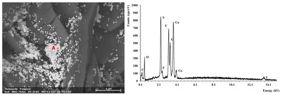 SEM photo of rabejacite aggregates with EDS spectrum (Point A).