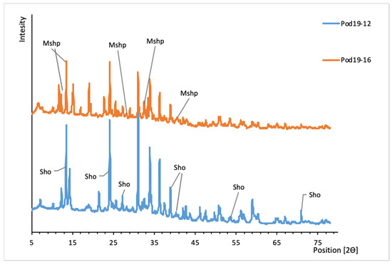 XRD patterns of uranyl oxide-hydroxides from Podgórze mine. Sho, schoepite; Mshp, metaschoepite.