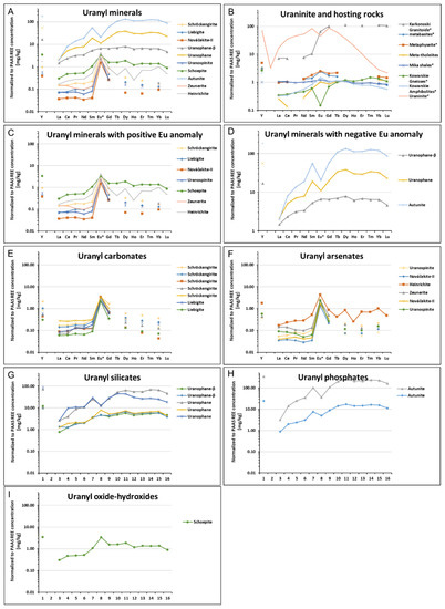 REE distribution patterns: (A) all uranyl minerals, (B) uraninite and surrounding rocks *, (C) first group of uranyl minerals, (D) second group of uranyl minerals, (E) uranyl carbonates, (F) uranyl arsenates, (G) uranyl silicates, (H) uranyl phosphates, and (I) uranyl oxide-hydroxides. * Literature data.