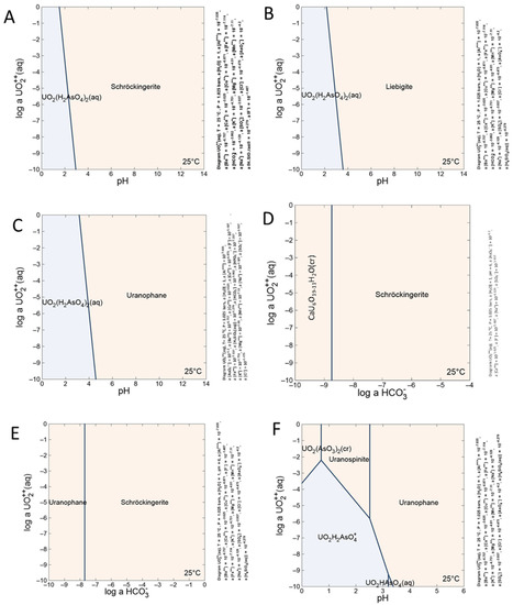 Stability fields of selected uranyl minerals from Podgórze mine. (A,B) Uranyl ion activity versus pH for schröckingerite and uranophane, respectively. (C,D) Stability fields of uranospinite–schröckingerite and uranophane–schröckingerite, respectively, depending on UO22+, HCO3−, and UO2(H2AsO4)2 (aq) activity. (E,F) Dependence on uranyl activity and pH of liebigite and uranospinite, respectively.
