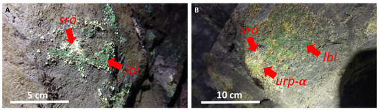 (A) Abandoned mine gallery in Podgórze mine; (B) sampling site with secondary uranyl minerals in adit 19 of the mine.