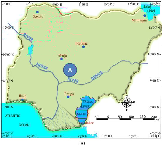 Map of Nigeria (A) showing the location of Cross River State. Insert (B) Generalized geological map of the study area using a cylindrical layer, made of lead to absorb X-rays generated when radiation made sudden contact with the detector. Before deploying the system for actual activity analysis, environmental radioactivity (background) counts were conducted by counting the activity of a sealed empty beaker put into the system for 12 h. The results were used to correct the net gamma peaks observed from the different isotopes using Genie 2000 computer software.