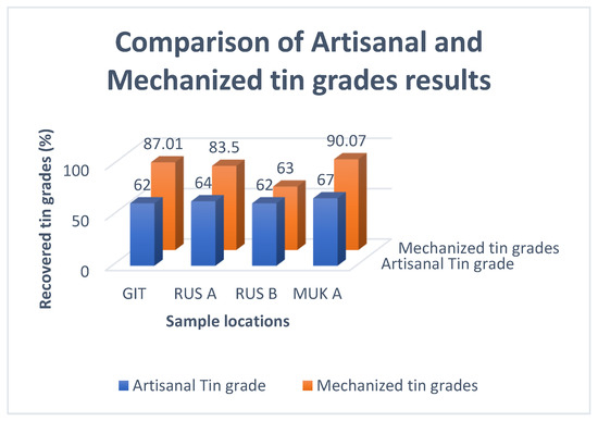 - Tin grades from the RUS B site were 1% higher than those from artisanal processing techniques;