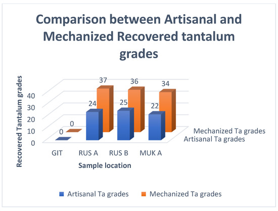- Tantalum grades from the RUS B site were 11% higher than those from artisanal processing techniques;