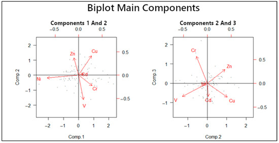 Principal component one (PC1) explains 49.3% of the variance with high loadings of Ni and Cr, both elements are usually related to the parent material so this component may be linked to a natural factor at the time of soil formation [35,36]. Figure 2 clearly shows how these two elements are very close to the axis of PC1, and clear isolation between Ni and the other elements can be seen. Principal component two (PC2) explains approximately 20% of the total variance, highlighting V with a negative charge and Cu and Zn with positive charges, these last two elements are also grouped in the cluster analysis Figure 3. Finally, principal component three (PC3) represents 13.97% of the variance, with Cr and Zn having positive values and Cd, Cu, and V having similar negative charges. Chromium, Cu, V, and Zn show a high load in two PCs, indicating two sources.