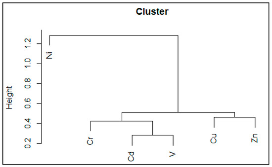 The variation matrix of the closed data was transformed into a distance matrix using the ward.D method. A dendrogram was generated (Figure 3) for the cluster analysis in which two groups composed of Cd–V–Cr and Cu–Zn can be seen at the second level. Nickel was finally incorporated in a third level, corresponding to the fact that it is the only element that had a significant loading value in only the first principal component and as seen in the biplot. Therefore, it is possible to attribute it to only one source of origin. In contrast, Cr, Cu, V, and Zn could come from more than one source.