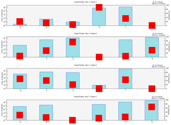 Different runs were performed in PMF to find the best solution. It was verified that with four factors, the model reaches a good solution since with five factors the improvement of the Q value is no longer significant. The distribution of the residuals of each variable (TE concentration) of the model is normally distributed with its deviations within ±2σ, reaffirming the solution (Figure 4).