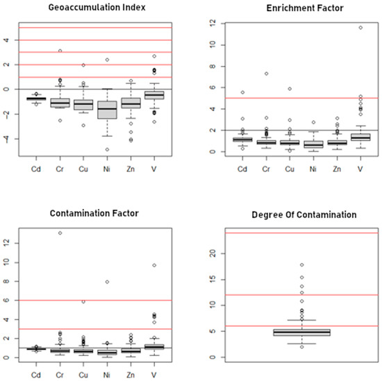 Thus, the contamination and ecological indices that will give the degree of soil contamination are determined as shown in Table S1, (see Supplementary Materials for further details).