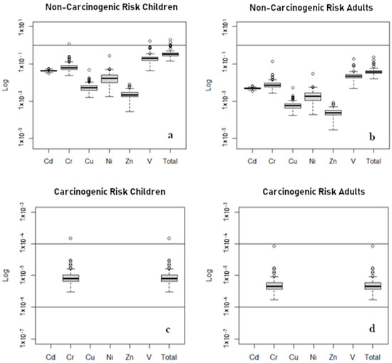 For the non-cancer risk to children (Figure 6a), most of the sample concentrations are below the significant risk limit, with the exception of one observation for Cr and V. The sum of the total risk for each sample is also within the limit with the exception of four samples. For the non-carcinogenic risk in adults (Figure 6b), all elements are within the safe limit, as is the total sum risk, so there would be no non-carcinogenic risk for adults in the commune. Vanadium is the element that contributes the most to the non-carcinogenic risk, both in children and adults. Chromium presents some degree of carcinogenic risk, although not significant (Figure 6c). Only one observation has a significant risk (>1.0 × 10−4) for this element, but, overall, the values are below the average of the risk interval. The values for the other elements indicate that no harmful exposure is present.