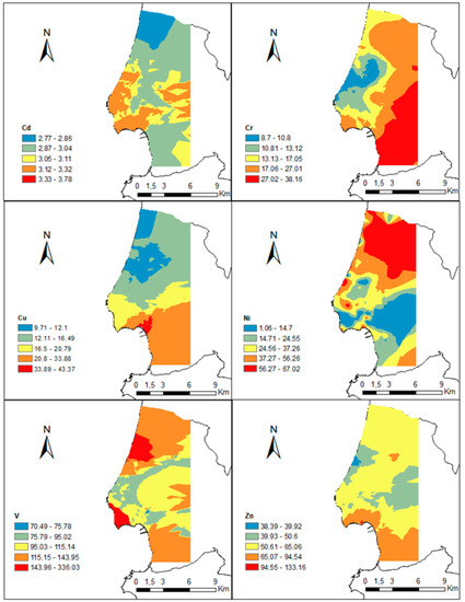 Spatial distribution of Cd, Cr, Cu, Ni, V, and Zn concentrations, in mg × kg−1.