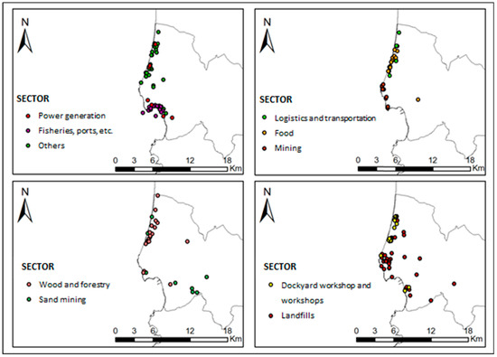 Figure 7 shows that the distribution of Cd in the area has a higher concentration in the central coastal zone of the commune, where a large number of industries are located, such as fishing, food production, mining, landfills and/or dumps, and power generation plants (Figure 8).