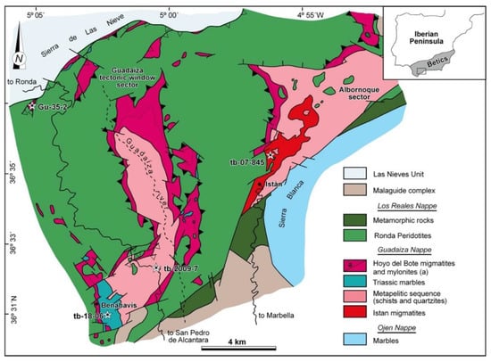 The geochronological studies carried out in the Guadaiza nappe have been mainly focused on (1) the granite dykes derived by the partial melting of the continental crust related to the dynamothermal aureole [23,48], (2) the dynamothermal aureole itself [20,23,49] and (3) the underlying anatectic sequence of Istan migmatites [33].