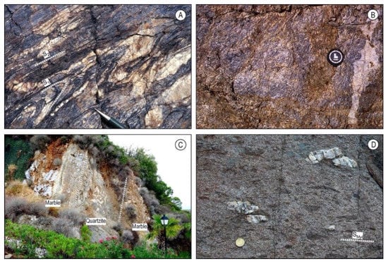 The lithological sequence of the Guadaiza nappe (Figure 1) is characterized by an undifferentiated Paleozoic metapelitic sequence with interlayered quartzites, schists and minor amphibolites [17]. This sequence is mainly characterized by abundant folded veins of quartz (Figure 2a) and a well-developed axial plane schistosity, S2. The metamorphic conditions of the metapelitic sequence range from the andalusite zone at upper levels to the sillimanite zone close to the underlaying Istan migmatites [17]. This member includes gneisses, diatexites, metatexites and medium to fine-grained leucogranites. Over the metapelitic sequence, coarse-grained layered marbles complete the lithological sequence of the Guadaiza nappe. The Triassic age is commonly assigned to these marbles, based on stratigraphic correlations with the less metamorphic Alpujarride units of the eastern Internal Zone of the Betic Cordillera [18,19].