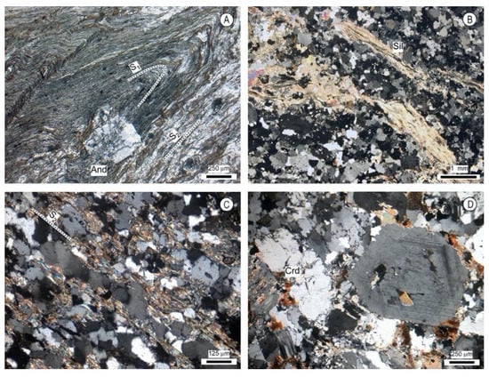 Textural photomicrographs of the analysed samples. (A) Detail of relations in schists between the S2 parallel to the axial plane of microfolds that deform an older S1-schistosity. The schistosity is defined by quartz biotite and graphite. Idioblastic porphyroblast of andalusite (And) growth on S2. Plane-polarized light (sample tb-2009-7). (B) Polymineralic sillimanite (Sil) flakes and parallel arrangement of quartz and plagioclase in the sample tb-07-845 from the Istan migmatites. Crossed polars. (C) Microscopic fabric of sample tb-18-06, a quartzite interlayered with marbles, showing a penetrative schistosity, S2, marked by the preferred orientation of recrystallized grains of quartz and muscovite. Crossed polars. (D) Idioblastic porphyroblast of plagioclase with inclusions of garnet and biotite. Cordierite (Crd) porphyroblasts and mosaic textures in recrystallized quartz indicate a high temperature deformation of sample Gu-35-2 (Hoyo del Bote migmatite). Crossed polars.