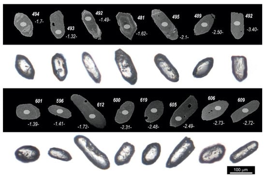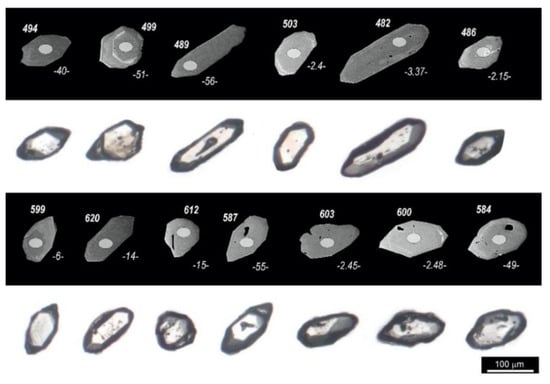 One hundred and seventy-five zircons were analysed by LA-ICP-MS. As in the Istan migmatite sample, the analysed zircon crystals are idiomorphic and display mainly bipyramidal morphologies (Figure 9). Single and composite core–rim structure zircons are observed. The crystals with composite structure have eroded and resorbed cores and sometimes are overgrown by a light and thin rim. Due to their thinness these rims could not be dated by LA-ICP-MS. Measured Th/U ratios are in between 2.4 and 0.01. Most zircons display Th/U ratios > 0.1 (n − 128) and only 13 zircon analyses have Th/U ratios < 0.1 (Figure 5).