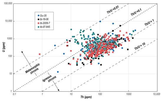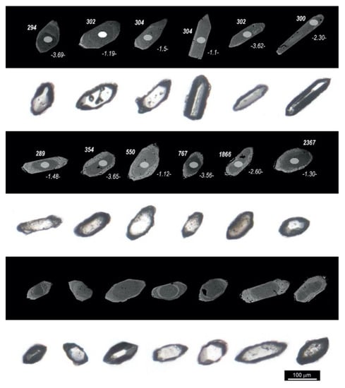 - Hoskin, P.W.O.; Schaltegger, U. The composition of zircon and igneous and metamorphic petrogenesis. Rev. Mineral. Geochem. 2007, 53, 27–55. [Google Scholar] [CrossRef]