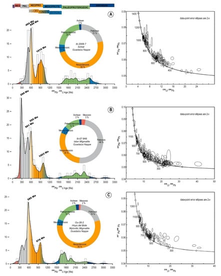 Tera-Wasserburg, Kernel Density Estimation (KDE) plots and histograms of age distributions of analysed zircons of Guadaiza’s samples. (A) tb-2009-1, (B) tb-07-845 and (C) Gu-35-2.