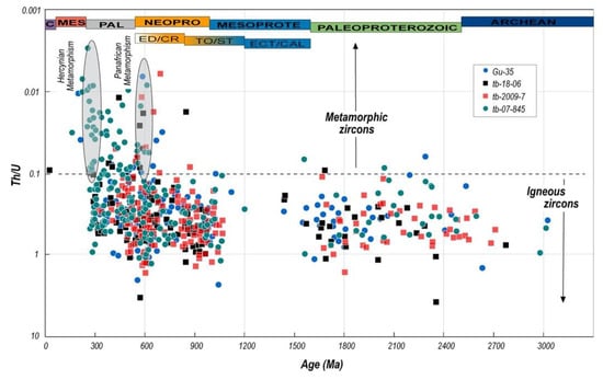 Although subjected to some uncertainties [38], the zircon Th/U ratio is used to discriminate between magmatic (Th/U > 0.1) and metamorphic (Th/U < 0.1) zircons, e.g., [39,40,41]. However, as examples of metamorphic zircon overgrowths with Th/U values higher than 0.1 or even igneous zircons with values lower than 0.1 have been reported, e.g., [26,42], this type of interpretation must be considered carefully. Most of the obtained Th/U ratios in zircon crystals from the Guadaiza nappe are higher than 0.1 (Figure 5 and Supplementary Material Table S1), which agrees with an igneous origin of the zircon crystals. Only a few zircon crystals linked to the ~600 and ~300 Ma age populations display Th/U values lower than 0.1 suggesting apparent metamorphic origins (Figure 7). The age population of ~300 Ma fits with the Paleozoic (late-Variscan) metamorphic event that has been already evidenced in the Istan migmatites (this work), whereas the Pan-African metamorphic belt of ~600 Ma, widely recognized in the Trans-Saharan belt due to the amalgamation of Gondwana, could be proposed as a hypothetical source of metamorphic zircons.