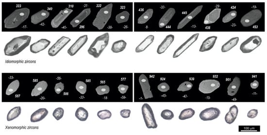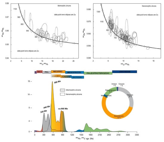 The general age distribution patterns (Figure 11) from 21 to 2768 Ma show that 70% of the analysed zircons are Precambrian in age, Neoproterozoic (52%; ca. 547–967 Ma) and Paleoproterozoic (15%; ca. 1.6–2.4 Ga) mainly, the rest being Mesoproterozoic (2%; ca. 1.4–1.6 Ga) and Archean (1%; ca. 2.8 Ga). The remaining analyses yield Paleozoic (29%; ca. 271–539 Ma) or Cenozoic (1%; ca. 21 Ma) ages. Several populations can be peaked for the xenomorphic (~600 Ma and ~1 Ga) and idiomorphic zircons, (~300 Ma and ~440 Ma) (Figure 11) with weighted average 206Pb/238U ages of 323 ± 4 Ma (n − 4), 442 ± 7 Ma (n − 6), 583 ± 5 Ma (n − 9) and 947 ± 10 Ma (n − 7) (Figure 11). A detailed observation of Th/U vs. 206Pb/238U ages of analysed samples agree that the idiomorphic zircons are younger than the xenomorphic ones (Figure 7). The youngest determined age populations for the xenomorphic and idiomorphic zircons are 481 ± 8 Ma (n − 4) and 289 ± 4 Ma (n − 3), respectively.