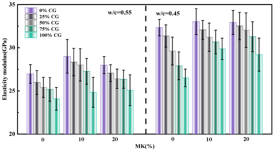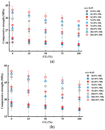 - The incorporation of <20% metakaolin and <50% CG in the specimens showed a higher or equivalent 28-day compressive strength compared with that of the control specimen. From the point of view of the environment and the economy, the replacement level of metakaolin and CG can be further increased. Compared to the control specimen, the specimen with 20% metakaolin and 75% of CG showed less than a 5% decline in compressive strength, which is acceptable.