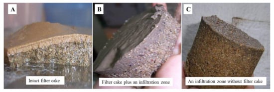 Three types of filter cake formation. (A) is an intact filter cake after the slurry particle accumulating; (B) is a filter cake plus permeation zone after the slurry particle accumulating; (C) is an infiltration zone without a filter cake after the slurry particle accumulating.